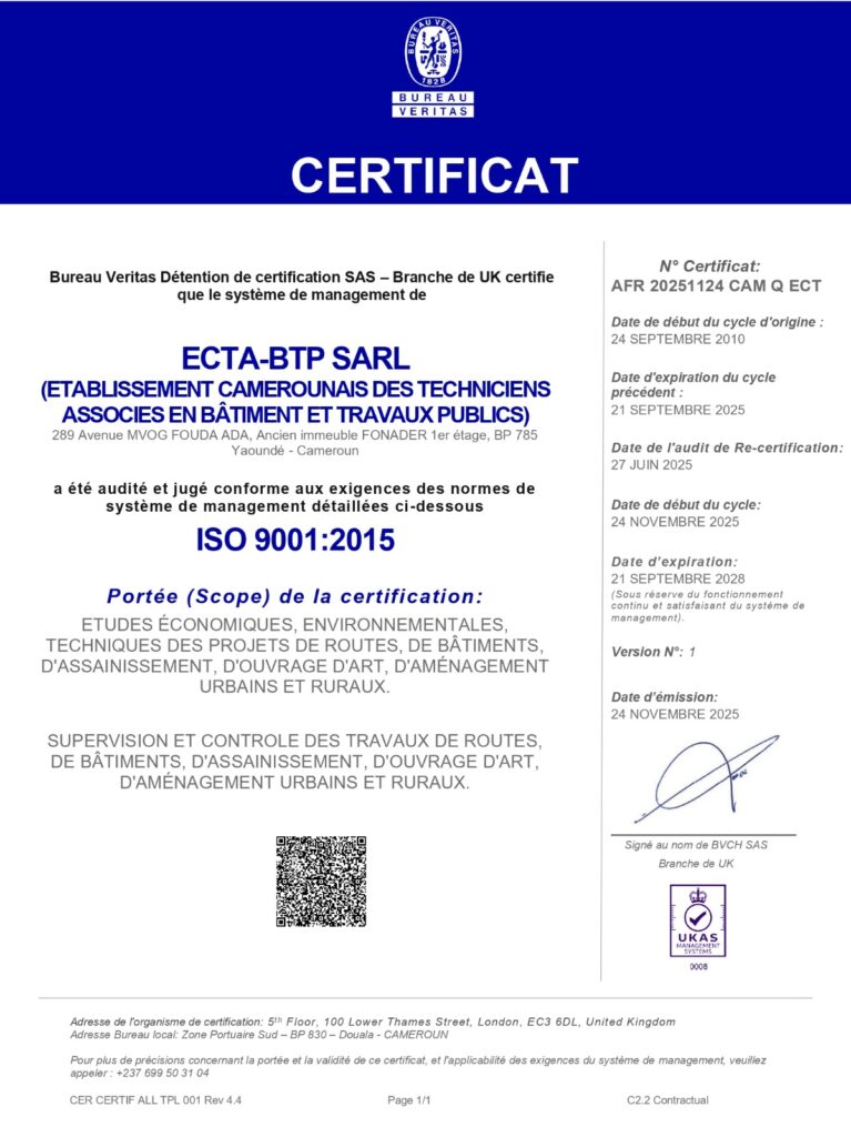 Depuis 2003, ECTA-BTP Sarl s’est engagé dans la démarche Qualité fondée sur l’amélioration continue de ses prestations et l’écoute de ses clients. A partir de Septembre 2010, ECTA-BTP Sarl jouit de la certification NF EN ISO 9001 : 2008. Certificat qui a été renouvelé en septembre 2013, en 2016 puis en 2019. En 2017 le système s’est conformé à ISO 9001 version 2015.